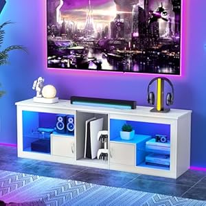 TV Stand, Modern Entertainment Center with LED and Cabinet for TV 70/75/80 Inch, 70 Inch Gaming Media Stand TV Console with Power Outlets for PS5 in Living Room and Bedroom, White