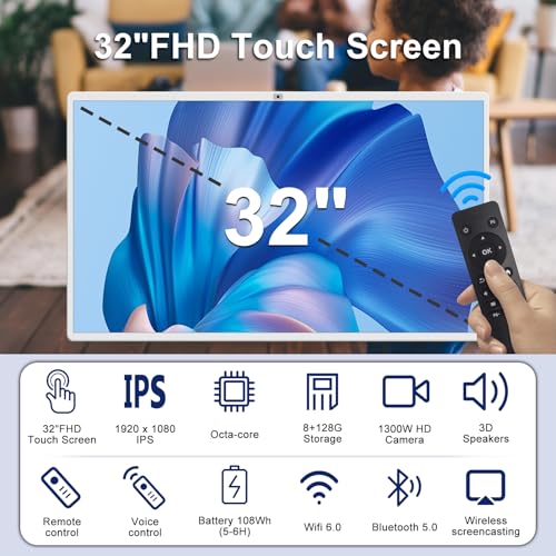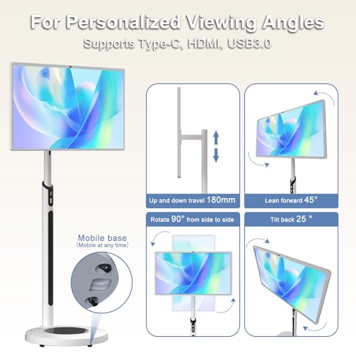 【32-inch Super Large Screen】Viyivwine portable TV incorporates a 32-inch large screen display and is equipped with a pole and a mobile charging base to constitute a mobile portable display. Blurring the boundary between TV and tablet. The flat surface is capable of rotating ±90°, and the touch screen can be raised and lowered by 18cm, inclined forward by 45 degrees, and backward by 25 degrees. It can be tilted from various angles to adjust the smart display screen. The portable smart touch screen supports 1920 X 1080 FHD, offering a high-definition visual experience and featuring a 4K ultra-clear front camera. You can conduct real-time video calls with family and friends.