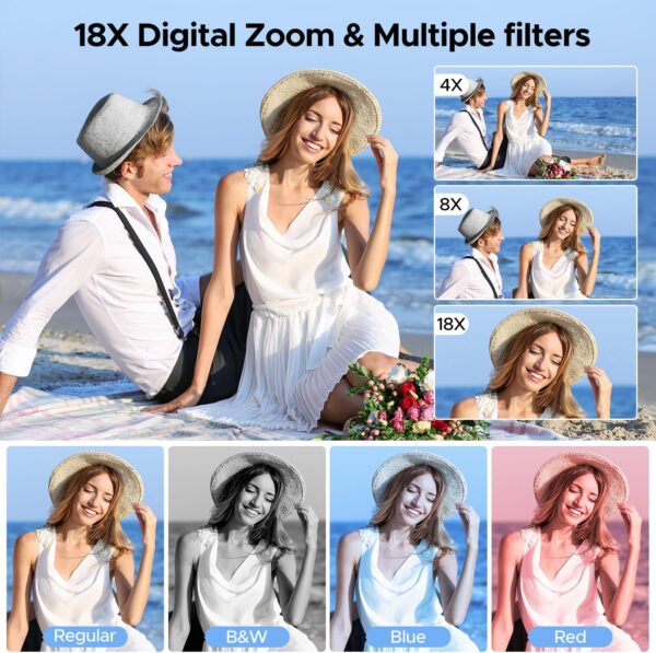 ๐ฎ๐ง๐๐ญ๐ข๐จ๐งใThis digital cameras has 18x digital zoom, which can easily capture every detail, whether close or far, ensuring that your footage is always clear and vivid. The travel camera is also equipped with a fill light to supplement the light source. Allowing you to take high-definition photos and videos in low-light conditions or dark conditions.
