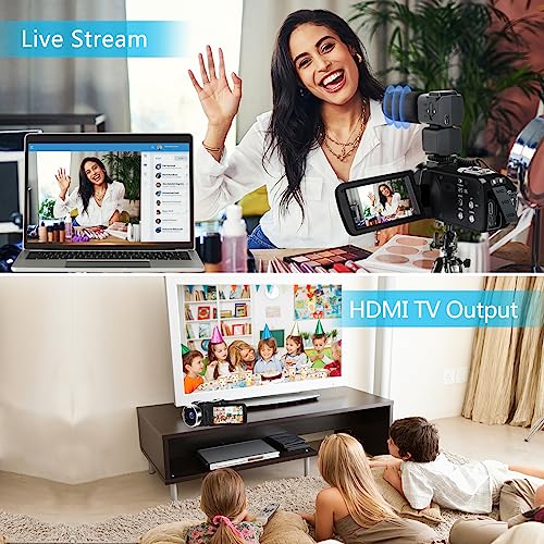 【Webcam & HDMI Output】The camcorder can be used as a webcam, just connect this 4K digital camera to your computer via USB cable and select “PC Camera” mode. Open Facebook, Youtube or Instagram page to start a video call and live stream from your computer. You can also play back your HD videos by connecting the camcorder to an TV using the HDMI cable.