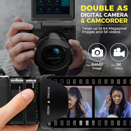 5K & 64 MP cameras for photography: This digital camera adopted SONY Photosensitive Chip, shooting clear photos pixel up to 64M, 48M, 40M, 30M, 24M12M, and video resolution up to 5K, 4K, 2.7K, 1080P, 720P, eliminating blurriness in your photography and videography.