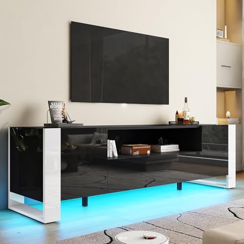 【MODERN HIGH GLOSS TV STAND】The glossy TV stand has full high-gloss visible on the whole surface. Made of UV high glossy coated MDF, ensuring sturdiness, waterproof and easy to clean.
