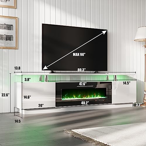 TV Console Dimension: 80.3″W x 14.4″D x 22.8″H. 80 inches television stand for flat or curved screen TV up to 90″.. Fireplace Dimension: 40″W x 5″ D x 14″H, can work with or without heat