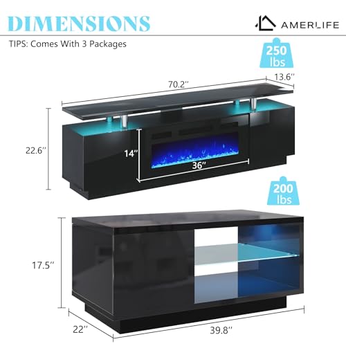 【Dimensions】TV Stand: 70.2″W x 14.4″D x 22.6″H, weight capacity 250lb, Coffee Table: 39.8W x 22D x 17.5H in, weight capacity 200lb, glass shelf 44lb, Fireplace: 36″W x 5″ D x 14″H, 750W/1500W Power