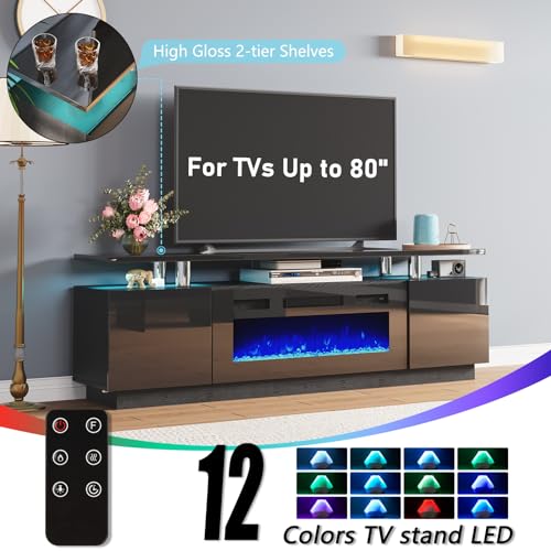 【70″ 2-tier Fireplace TV Stand】with 36″ multi-functional electric fireplace features 3 colors 5 brightness realistic flame & 12 colors LED lights. Heat and flame separate control, support TVs up to 80″