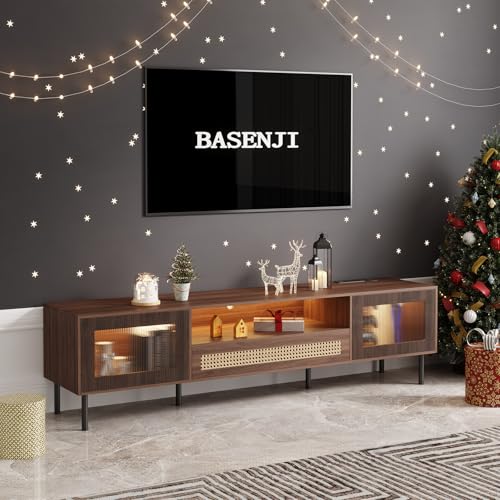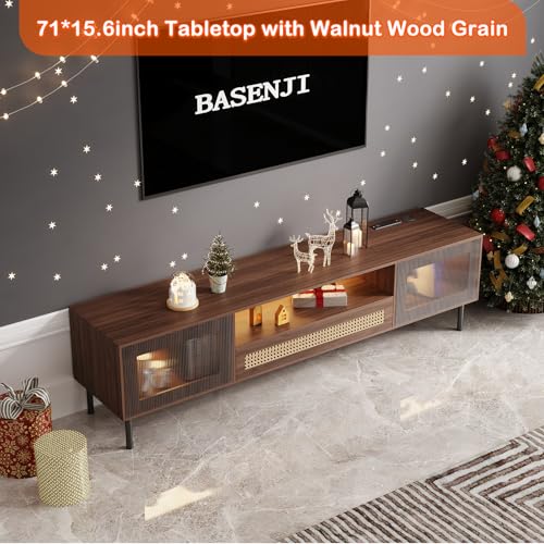 【LONG GAMING TV STAND】: The basenji 71inch gaming TV stand has a smart LED light strip. You can adjust the color according to your personal preferences, and the light can also dance with the music. The two doors of the TV stand have a hollow light-transmitting design. The designer used different styles of acrylic panels to make the light more varied. The thoughtful design makes games, gatherings, and birthday parties more interesting and colorful.