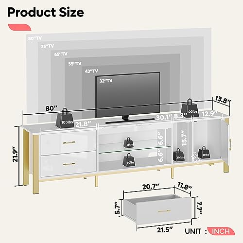【Large 80 inch TV Stand with RGB Lights】Our modern LED TV stand can perfectly match any style of room decoration, and is very suitable for living rooms, bedrooms and offices. Drawers with padded hinges reduce noise when closing.You can choose hundreds of colors to customize your atmosphere,ideal for birthday, gaming play, family union, home party or other special days.