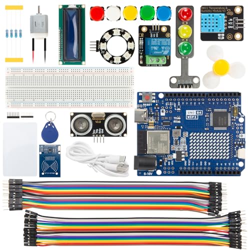 [Rich Accessories and Expansion Capabilities]: The UNO R4 WiFi kit includes a variety of components such as relays, 1602 modules, temperature and humidity sensors, traffic lights, LED rings, 130 motors, RFID modules, buttons, jumper wires, resistors, and breadboards, supporting a range of small to medium-sized experiments. These accessories make the UNO R4 WiFi a versatile development platform suitable for various projects and learning needs.