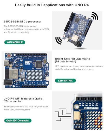 [Supports Arduino IDE for Programming and Learning]: The UNO R4 WiFi is fully compatible with the official Arduino IDE, allowing developers to use the existing Arduino ecosystem and a wealth of libraries for programming and learning. This compatibility ensures that both beginners and experienced developers can quickly get started, and it also facilitates the integration of educational resources and teaching activities.