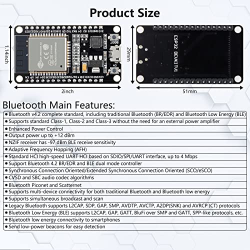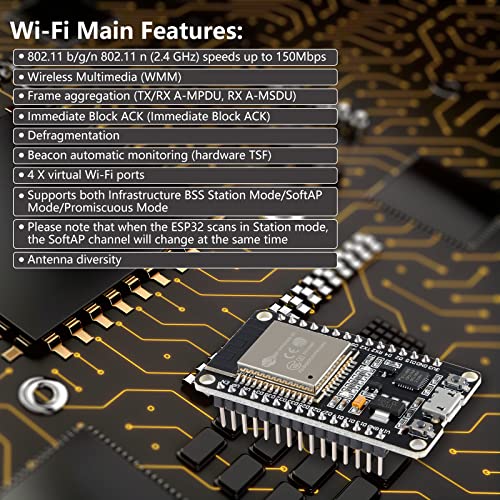 ♥Wi-Fi main features: 802.11 b/g/n 802.11 n (2.4 GHz) speeds up to 150Mbps Wireless Multimedia (WMM) Frame aggregation (TX/RX A-MPDU, RX A-MSDU) Immediate Block ACK (Immediate Block ACK) Defragmentation Beacon automatic monitoring (hardware TSF) 4 X virtual Wi-Fi ports Supports both Infrastructure BSS Station Mode/SoftAP Mode/Promiscuous Mode Please note that when the ESP32 scans in Station mode, the SoftAP channel will change at the same time Antenna diversity