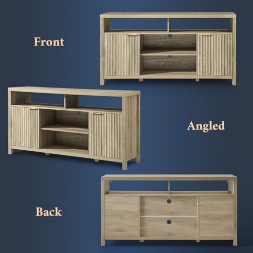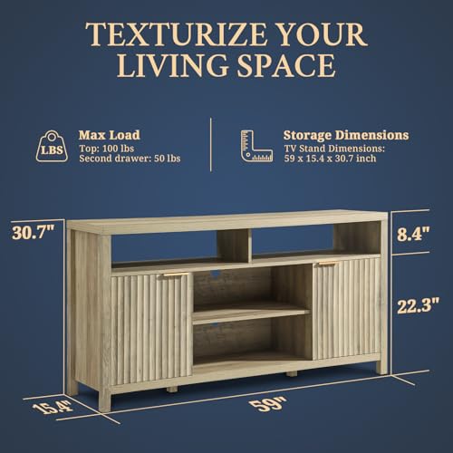 Accommodates TVs up to 65 Inches:This farmhouse tv stand is thoughtfully designed, measuring 59″ in width and 30.7″ in height, to accommodate TVs ranging from 50 to 65 inches. Its sizing ensures compatibility with various television models. With its seamless blend of functionality and aesthetic appeal, it serves not only as the media center for your family but also as a refined and tasteful decoration for your living room, office, or lounge.