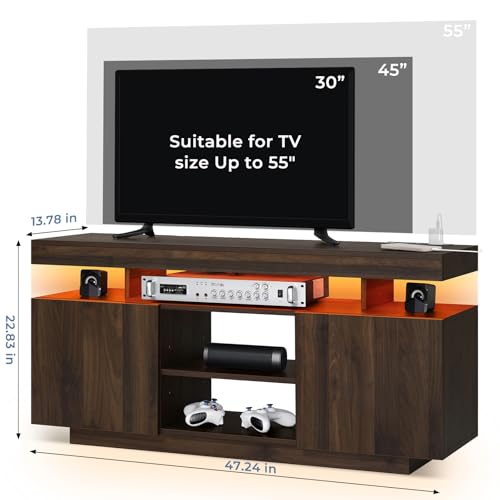【Walnut Entertainment Center】Upgrade your living room with the dark brown TV table measuring 47.24″L x 13.78″W x 22.83″H. The high gloss finish and cool LED lights add a sense of fashion to your space. Suitable for TVs up to 55″, this stand will give your living room a modern and minimalist look