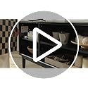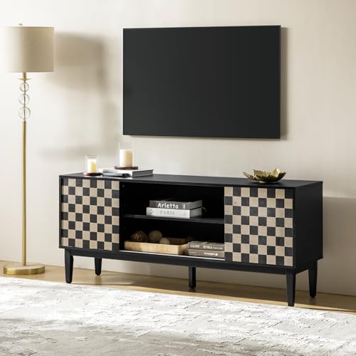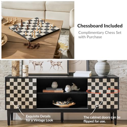 Dual-Design TV Stand- This TV stand features practical double-sided doors. One side displays a unique V-shaped, while the other side is inspired by chess and can be used as a functional chessboard.A chess set will come with the TV stand.