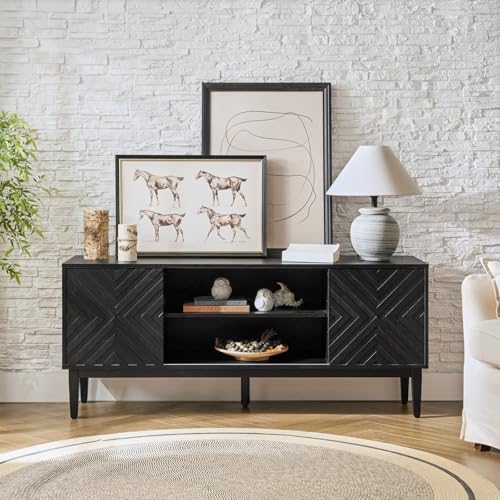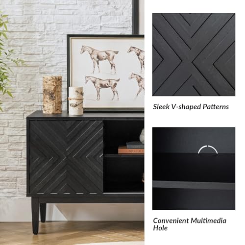 Stylish Modern TV Console Cabinet- The TV cabinet features a unique V-shaped pattern on the doors. . It shows modern aesthetics, adding a contemporary touch to any interior design.