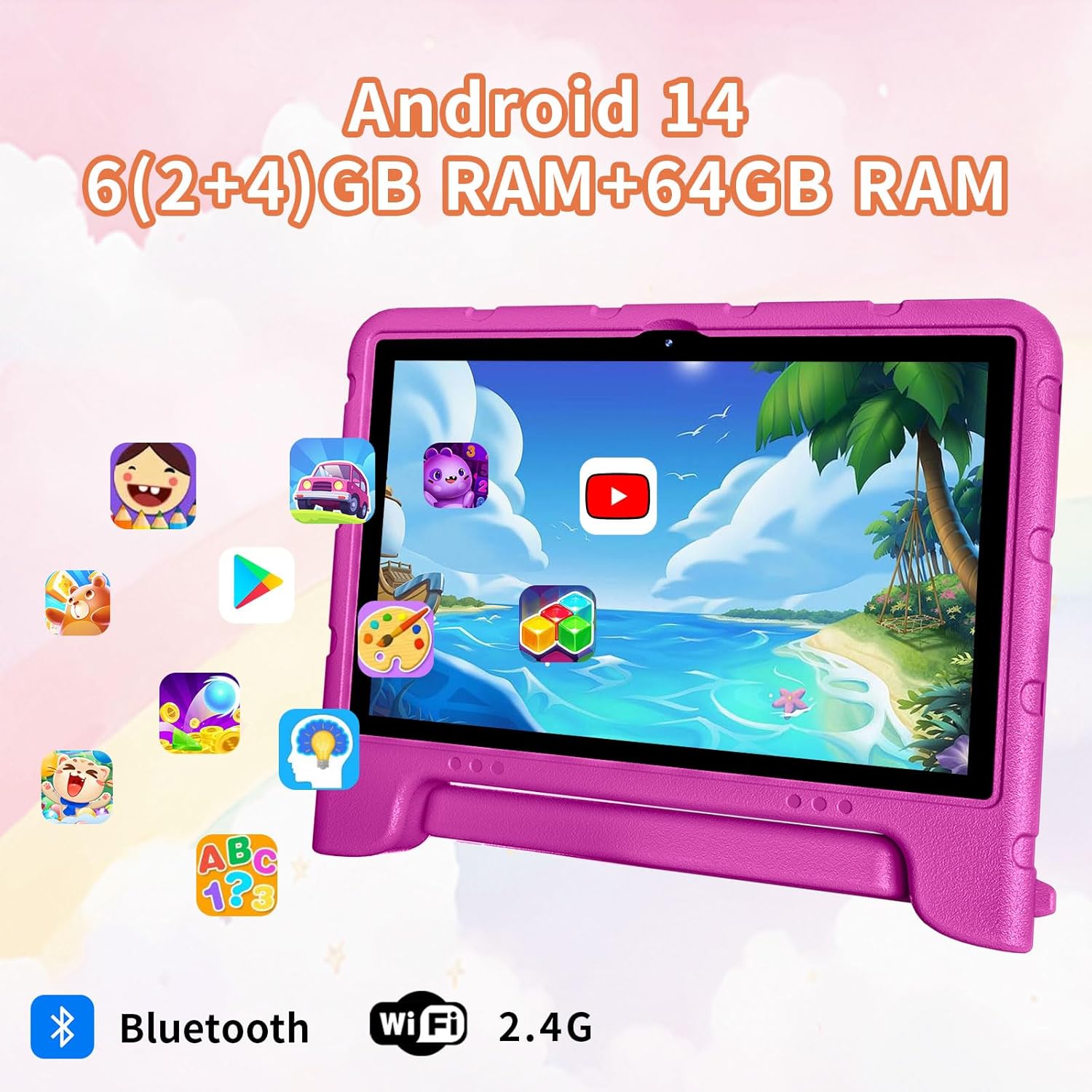 Latest Android 14 Tablet: The Kids Tablet comes with the latest Android 14 operating system, which is safer and faster than previous Android versions. Quad-core for seamless multitasking. 6GB RAM and 64GB ROM, and an expandable microSD card slot up to 1TB, perfect for watching videos, studying, video chatting, and reading eBooks with ease.