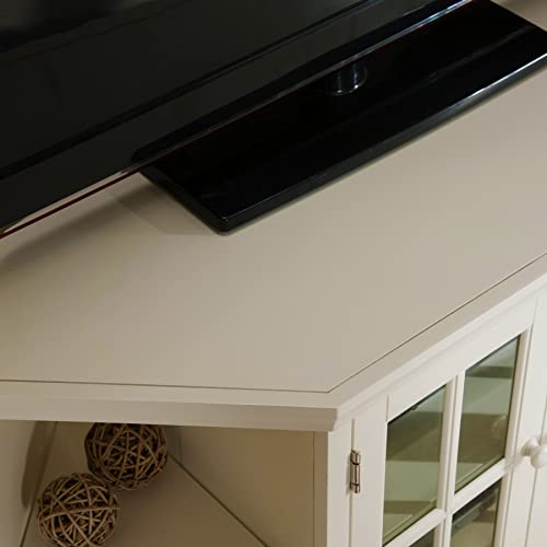 Efficient Design: The Maelyn 46-Inch Corner TV Stand in Cottage White is crafted to hold TVs from 32 inches to 50 inches; With overall dimensions of 46″ L x 20″ W x 25″ H and a component opening of 24″ W x 18-3/8″ D x 19″ H, it optimizes living space with a clipped corner design to fit seamlessly into corners