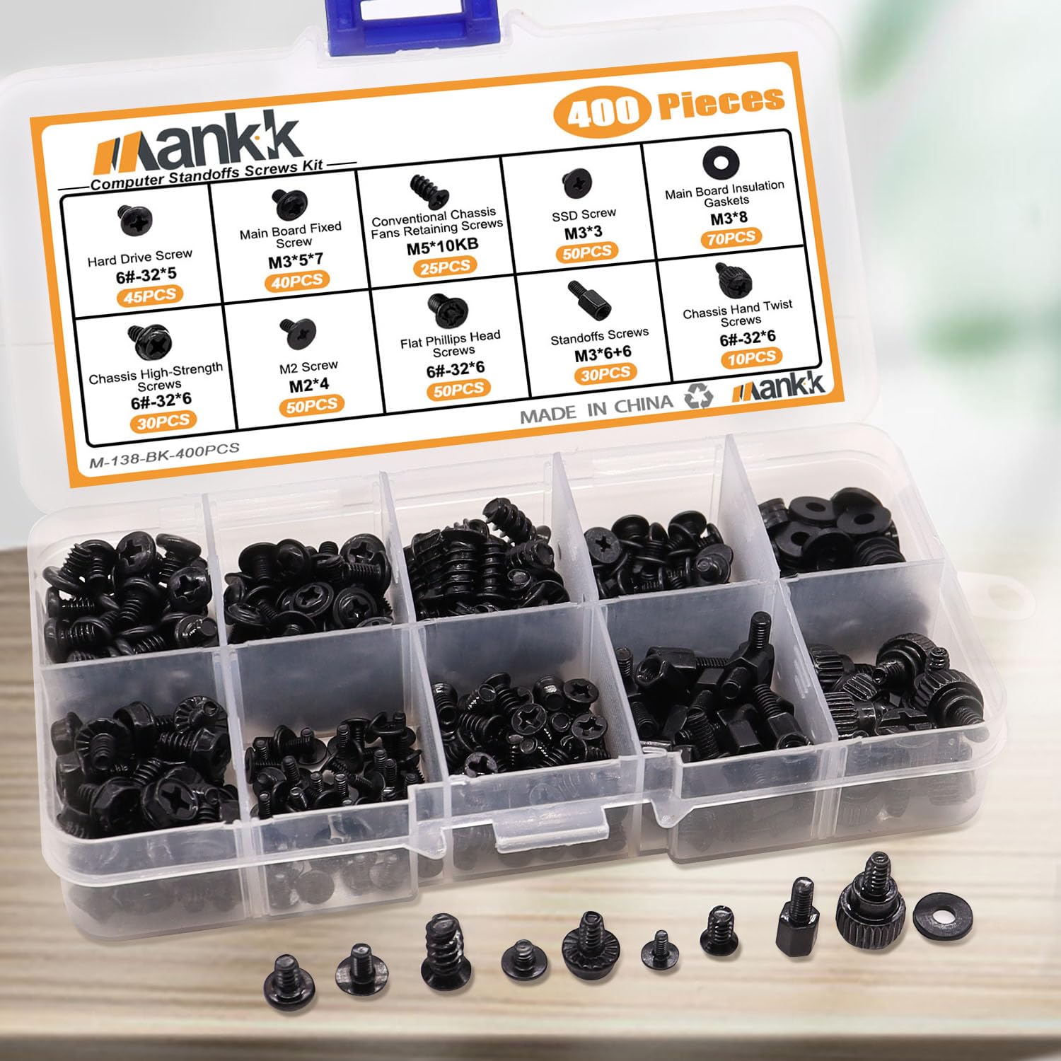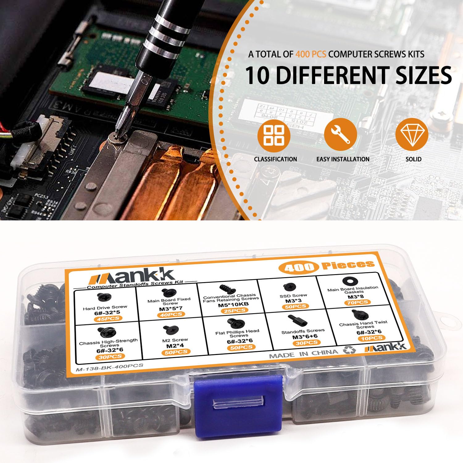 【Easy to Use 】A total of 400 PCS computer screws kits,10 different sizes,enough replacement to suit your needs.The are placed in a transparent plastic box, each size of computer screws are sorted separately which is easy to transport and distinguish.