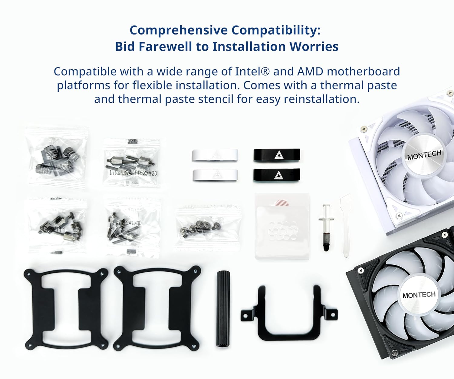 MONTECH HyperFlow ARGB 240 – AIO CPU Liquid Cooler, Intel&AMD Compatible, Chart-Topping Performance, Enhanced 3100RPM Water Pump Design, 3X Metal Pro 12 ARGB Ultimate Cooling Fans – White