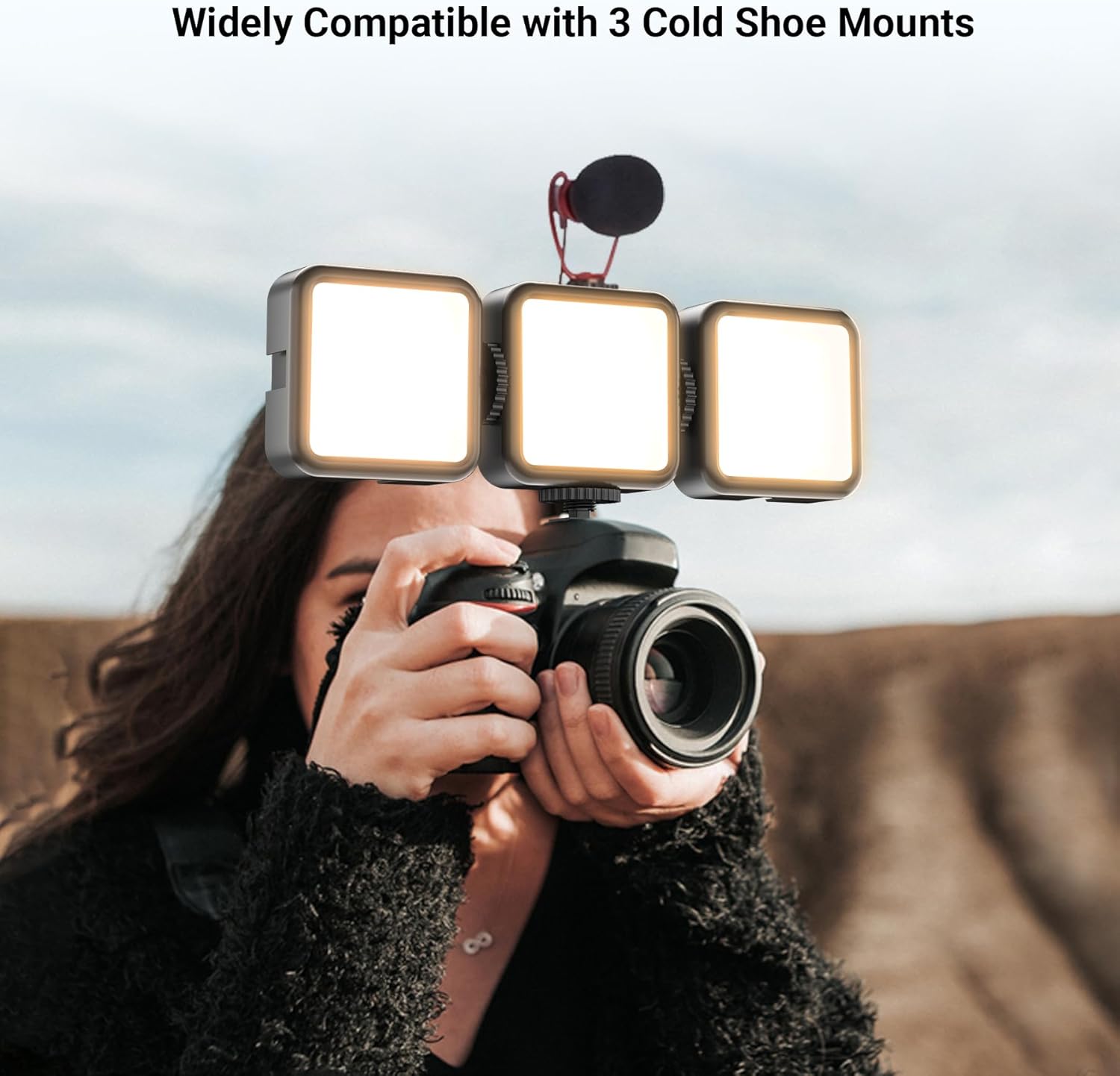 【3 Cold Shoe Mounts & 1/4″ Thread】The bottom of the LED camera light is equipped with a cold shoe and a 1/4″ screw hole, which can be installed on DSLR cameras, camcorders, tripods, and light stands. The dimmable LED video light panel is designed with 3 cold shoe mounts that can not only install microphones, but also be combined with multiple light panels for brighter lighting.