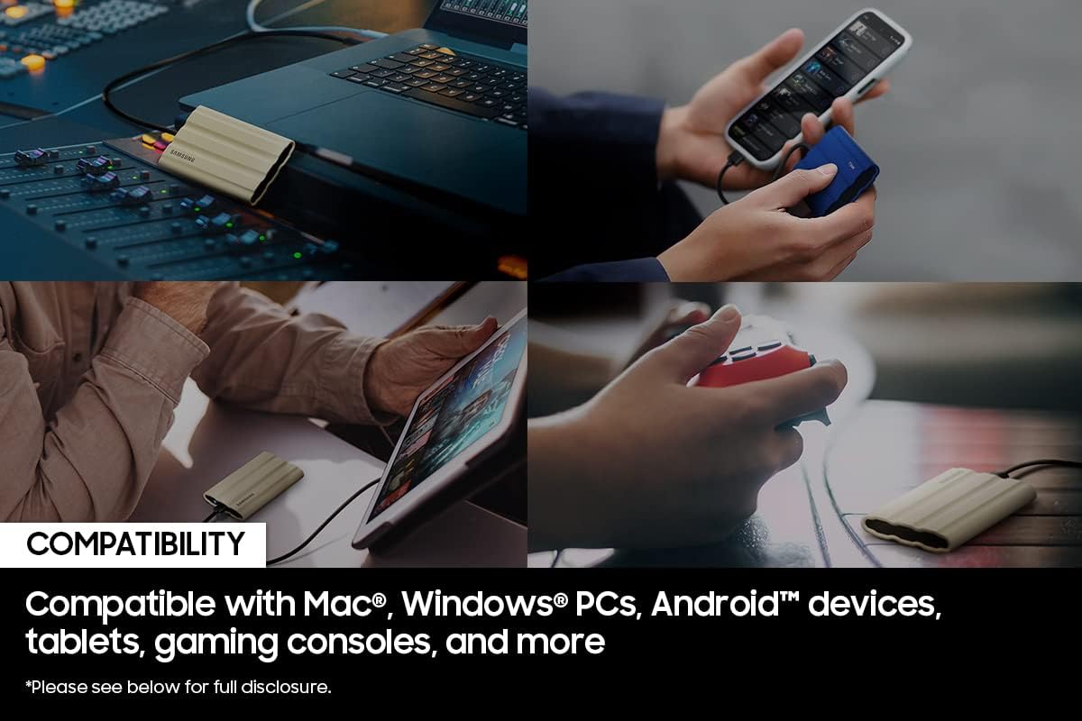 Samsung T7 Shield Portable SSD delivers high performance on-the-go, not matter the terrain. It has an IP65 rating for water1 and dust2 resistance, with Dynamic Thermal Guard to manage heat control. Transfer huge files instantly. USB 3.2 Gen 2 and PCIe® NVMe achieve soaring sequential read/write speeds of up to 1,050/1,000 MB/s4, allowing you to edit directly from the drive. The rugged design and advanced outer elastomer add extra durability to even endure a 9.8 foot drop3. The T7 Shield is compatible with PC, Mac, Android devices, gaming consoles, and more. 1Consistent with IP65 rating, tested under controlled conditions: water flow of 100kPa for 3 minutes. Water resistant capabilities may vary depending on the actual conditions. 2Consistent with IP65 rating, tested under controlled conditions: 2kg/m³ of active dust with a pressure under 2kPa for 8 hours. Dust resistant capabilities may vary depending on the actual conditions. 3Tested to withstand 9.8-ft (3 meters) drop under controlled conditions. Drop resistance capability may vary depending on the actual environmental conditions. 4Performance may vary depending on host configuration. To reach maximum read/write speeds of up to 1,050/1,000 MB/s, respectively, the host device and connection cables must support USB 3.2 Gen 2 and the UASP mode must be enabled. 5Tested to withstand 9.8-ft (3 meters) drop under controlled conditions. Drop resistance capability may vary depending on the actual environmental conditions. 6Source: 2003-2022 OMDIA data: NAND suppliers’ revenue market share. 7Included SSD cable recommended.