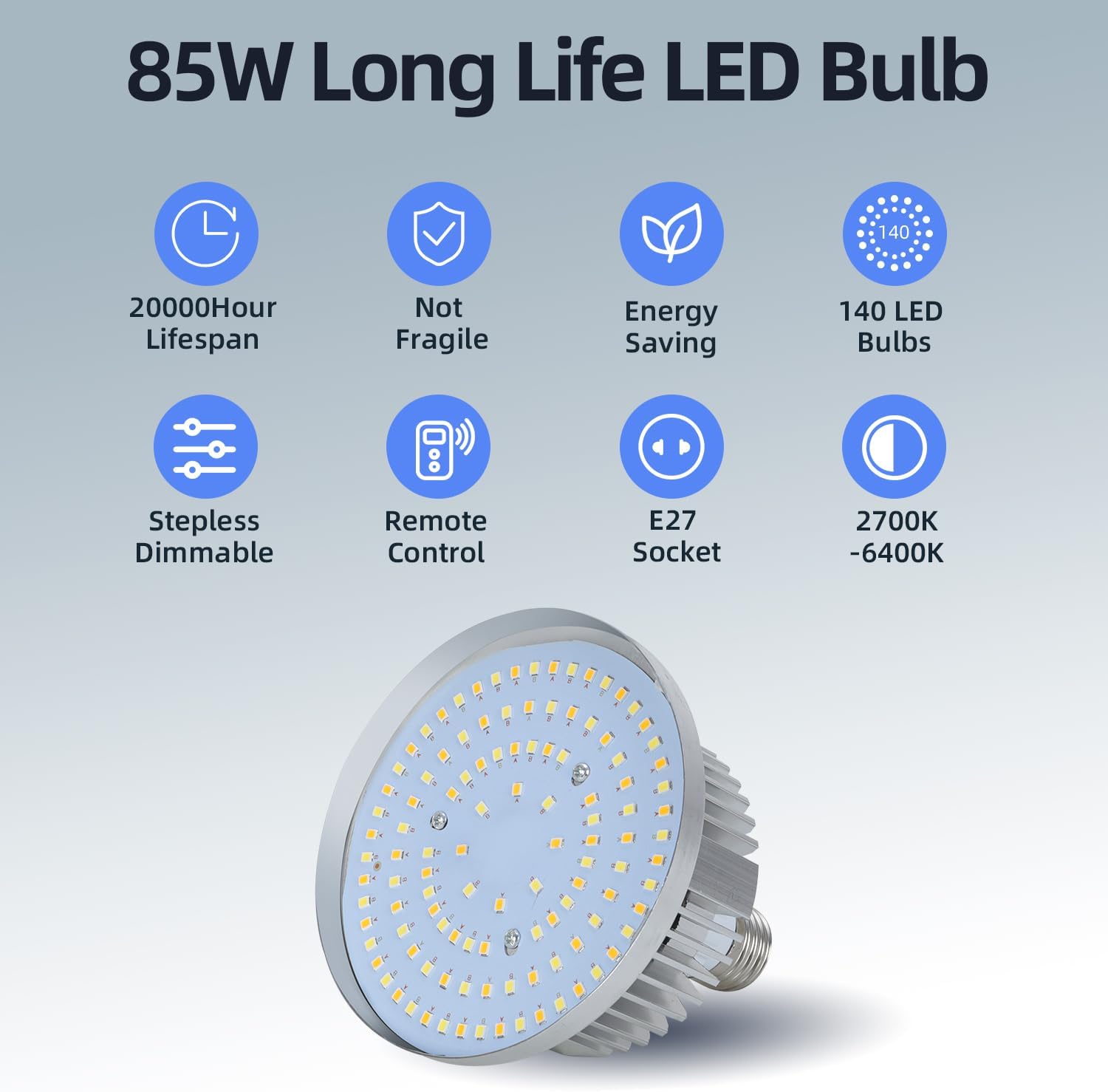 Updated LED Bulbs: 3-Color dimmable led bulbs with diffuser built-in, color temperature 2700-6400K and brightness 1-100% adjustable via remote control.