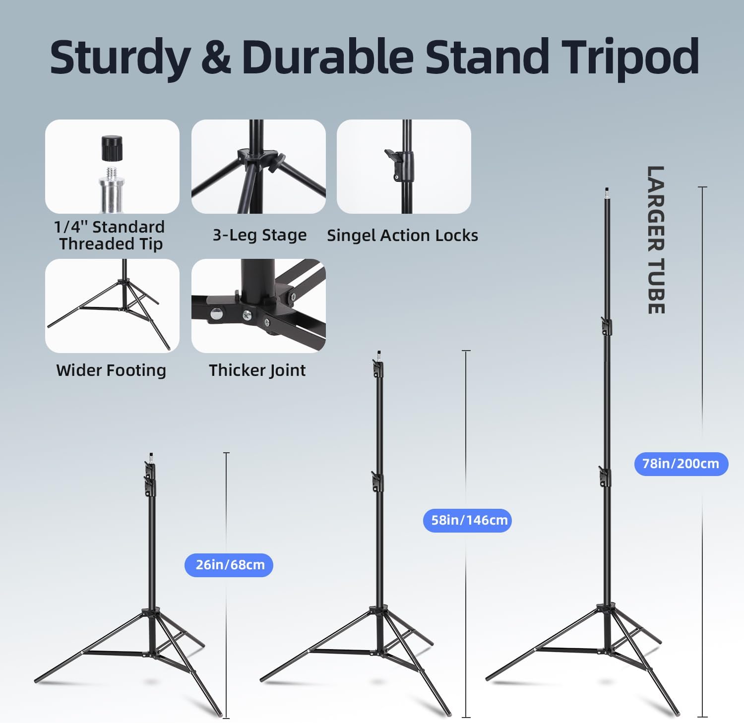 Rotatable Head & Adjustable Stand: The light stand tripod height adjustable from 26 to 79 inch/66cm to 200cm, 3-section column legs, made of aluminum alloy more sturdy and stable. Angle can be 210°adjustable lamp holder, which can suit for different perfect shooting with 1/4-inch Standard Screw Thread Tip. And with extra-long 8.5Ft/250cm cable,greater range of movement convenient for shooting photography.