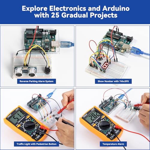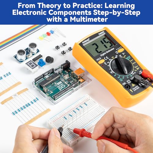 Comprehensive Learning with Multimeter: The kit includes Original Arduino Uno R3, a handbook with 25 lessons, step-by-step guidance, code examples, and diagrams. It uses a multimeter to teach essential electronics principles interactively, designed for beginners aged 8 and up