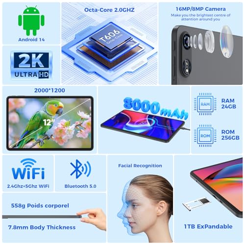 【Android 14 tablet, 256GB ROM】 Android 14 tablet 24GB RAM (8GB RAM + 16GB extend), 256 ROM allows you to store more photos and documents. A micro SD card slot expands storage up to 1TB (FAT32 format, sold separately) so you can store all your favorite media files together, including ebooks, videos, photos. Android 14 and GMS certified, allowing you to download popular apps from the Google Play Store.