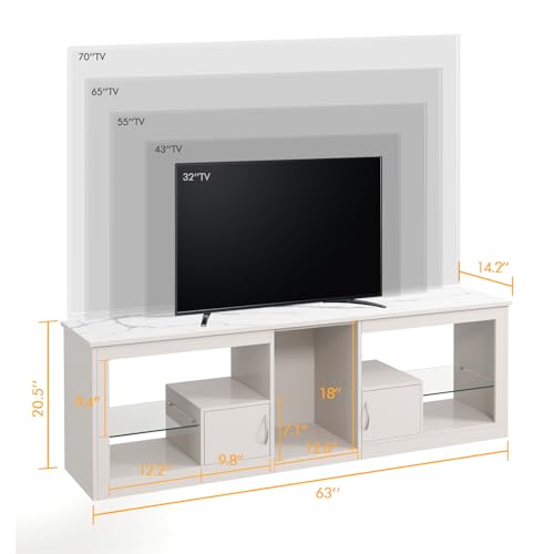 Modern TV Stand: Dimension of the TV stand is 63”L x 14.2”W x 20.5”H, suitable for TVs up to 70 inches. Its beautiful appearance not only enhances the overall tone of your living room, but also highlights your taste and personality.