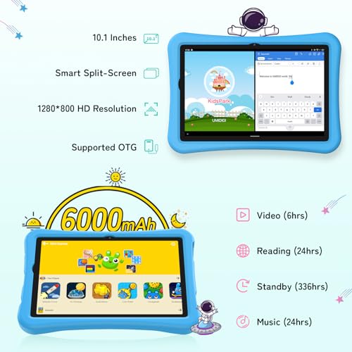 10.1 inch Touch Screen and Long Lasting Battery: LCD 10.1 inch tablet with 1280*800 HD display screen with low blue light eye protection; Smart split screen improves work efficiency; The 6000 mAh battery tablet keeps children to have fun all day