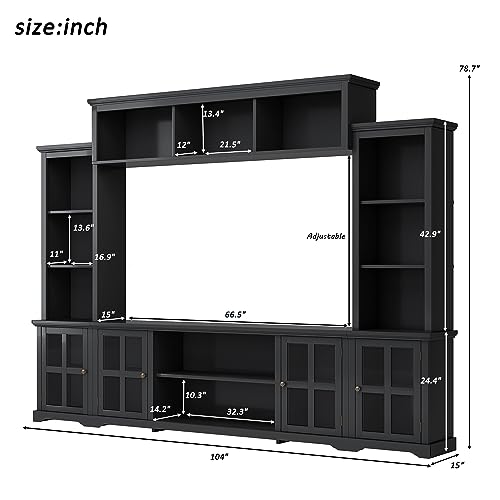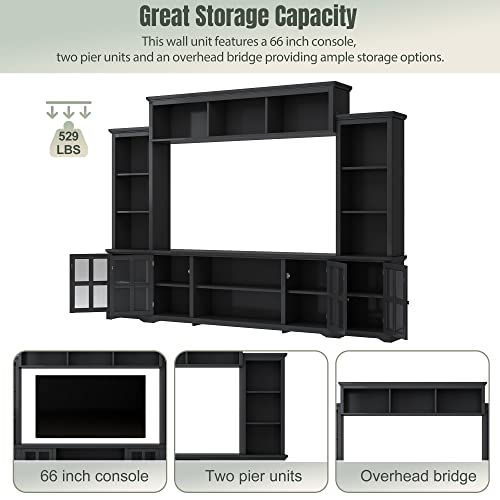 ๐ ๐จ๐๐๐๐ ๐บ๐๐๐๐๐๐ ๐ช๐๐๐๐๐๐๐: This entertainment wall unit includes a 66 inch wide TV console which fit for TVs up to 70Inch, two pier units, and an overhead bridge. It features multiple open tiers for easy access and two-tier shelves behind each door, offering dust protection and sturdy support for your media devices. With an overall weight capacity of 529Lbs and detailed load specifications for each part, it effortlessly meets a variety of storage needs.